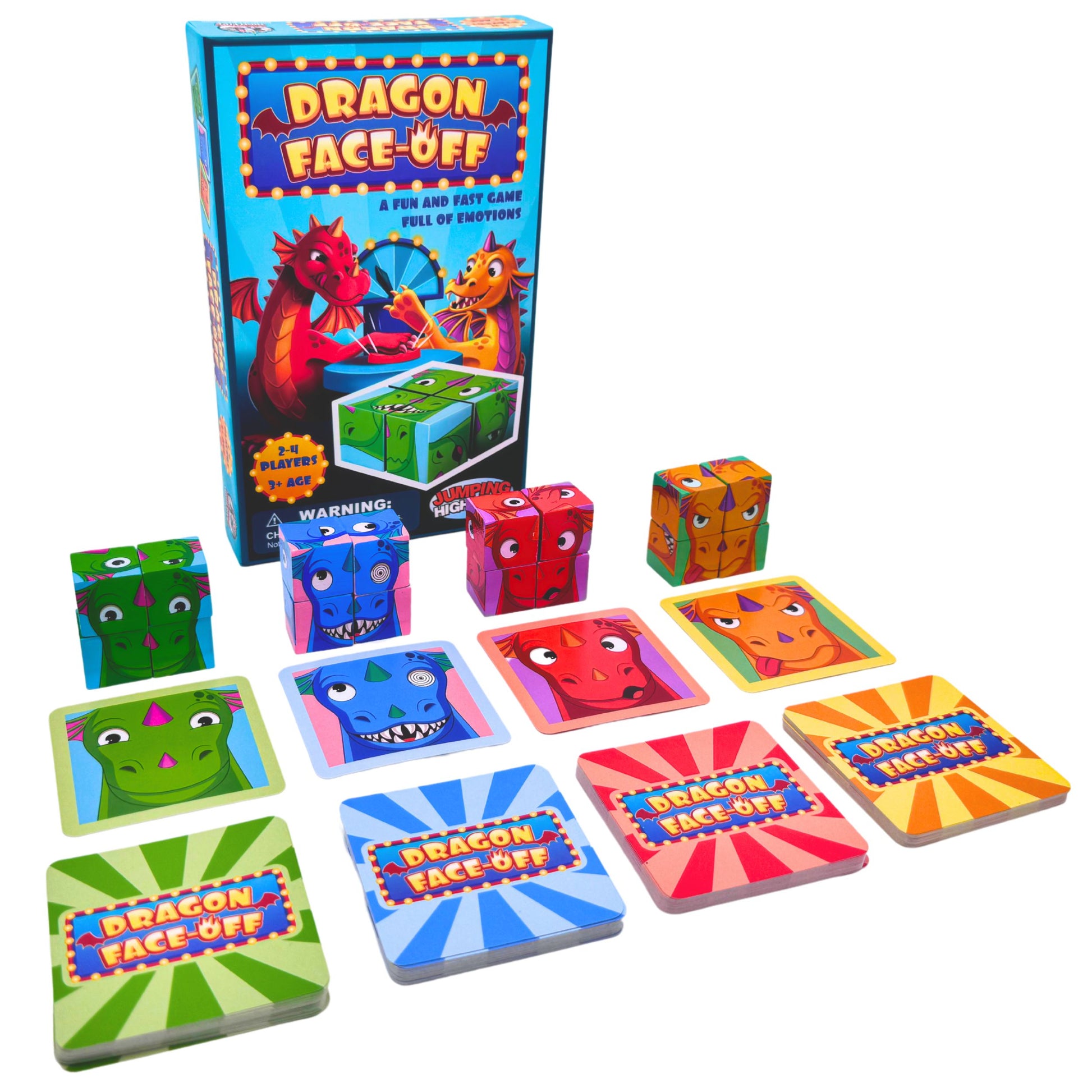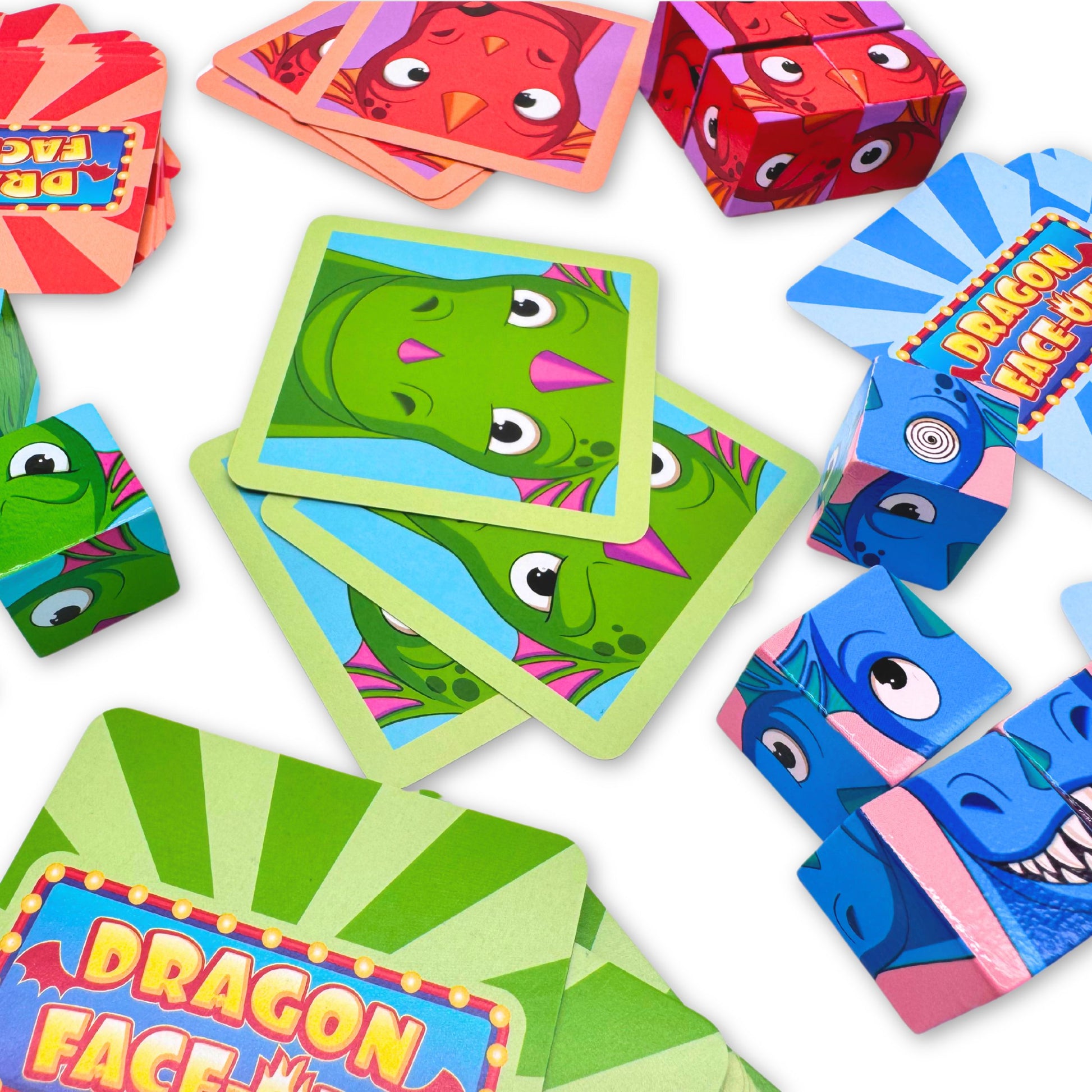 Face-Off in a race to create silly dragon faces that match your dragon cards. Once the game starts, players must flip over a new expression card and work quickly to flip their blocks around and create a matching expression for their dragon. The first player to correctly match their dragon’s silly face wins the round!